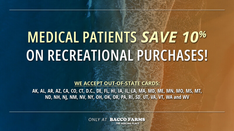 At Bacco Farms, we appreciate our medical patients, which is why we offer a 10% dispensary discount every day. Whether you rely on cannabis for chronic pain, anxiety, or other health conditions, we’re committed to providing affordable access to the medicine you need. Take advantage of this daily cannabis discount and enjoy savings on all your medical cannabis purchases at Bacco Farms.